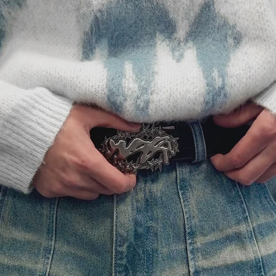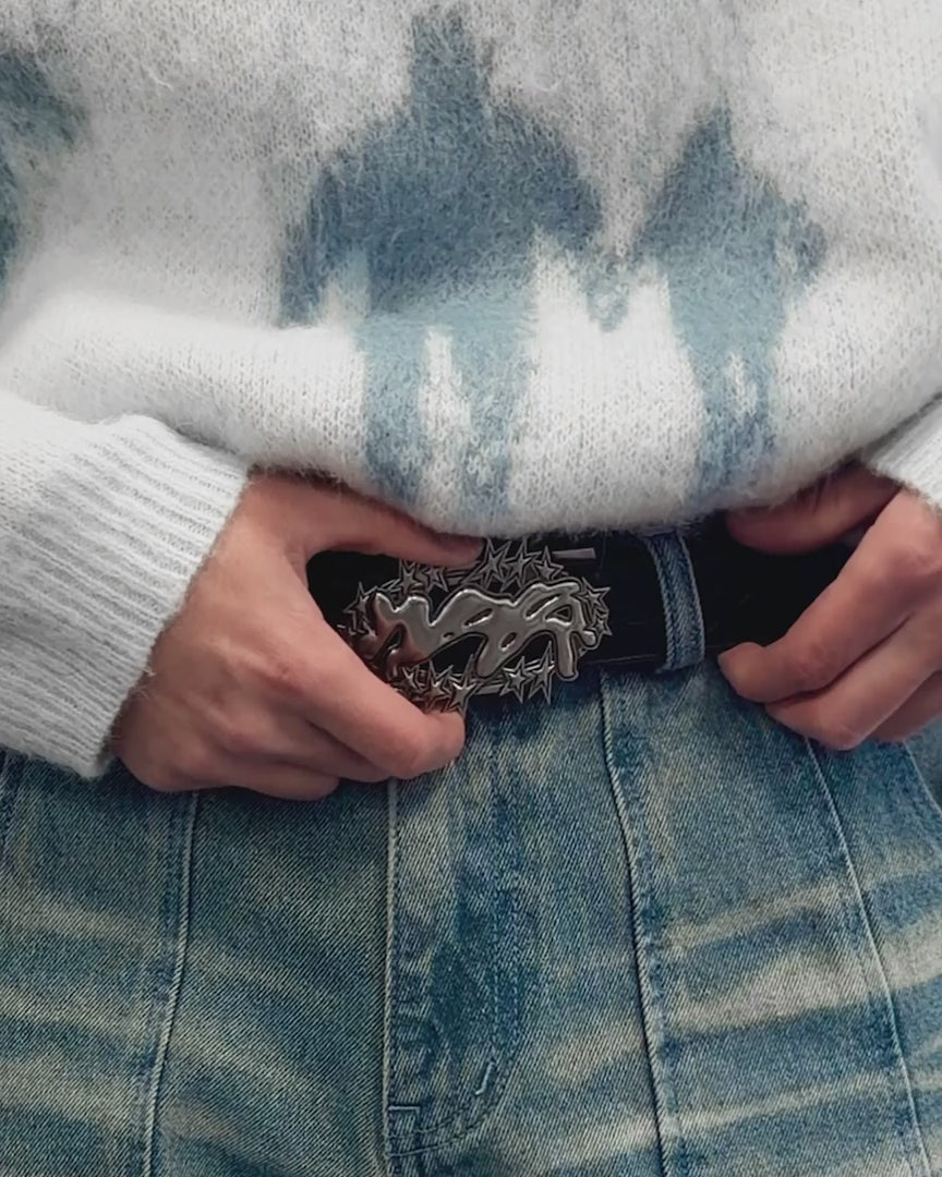 The buckle is made from zinc alloy, molded into a dynamic silhouette surrounded by sharp star motifs. The belt is equipped with an automatic locking system, allowing for seamless adjustment without traditional holes, ensuring both comfort and precision.