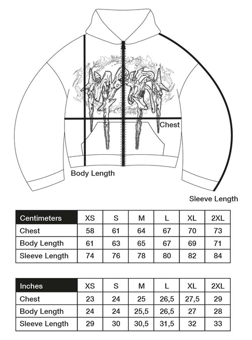 The model is 1m80 (5'9"), 65kg (143lbs) and wears a zip hoodie size M.