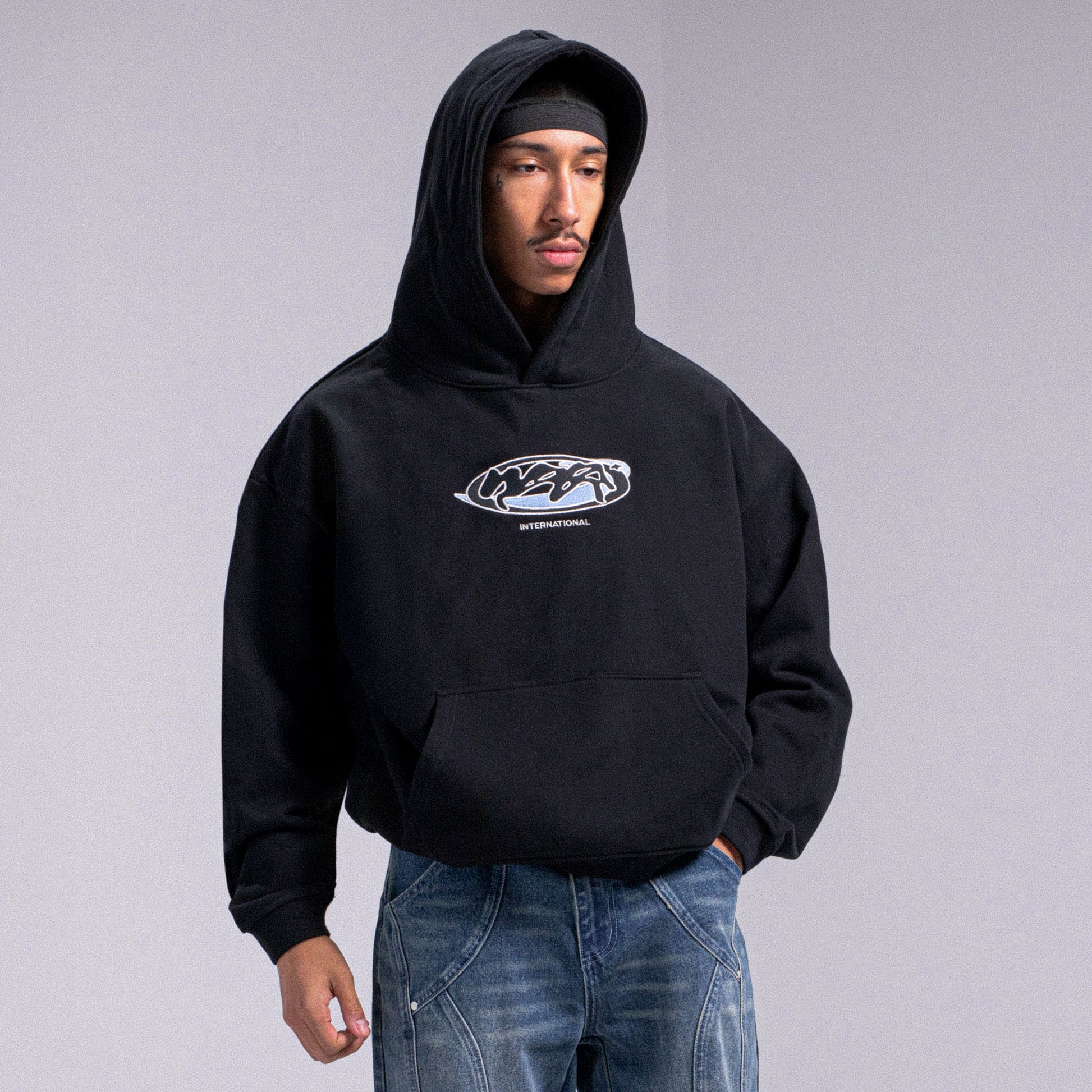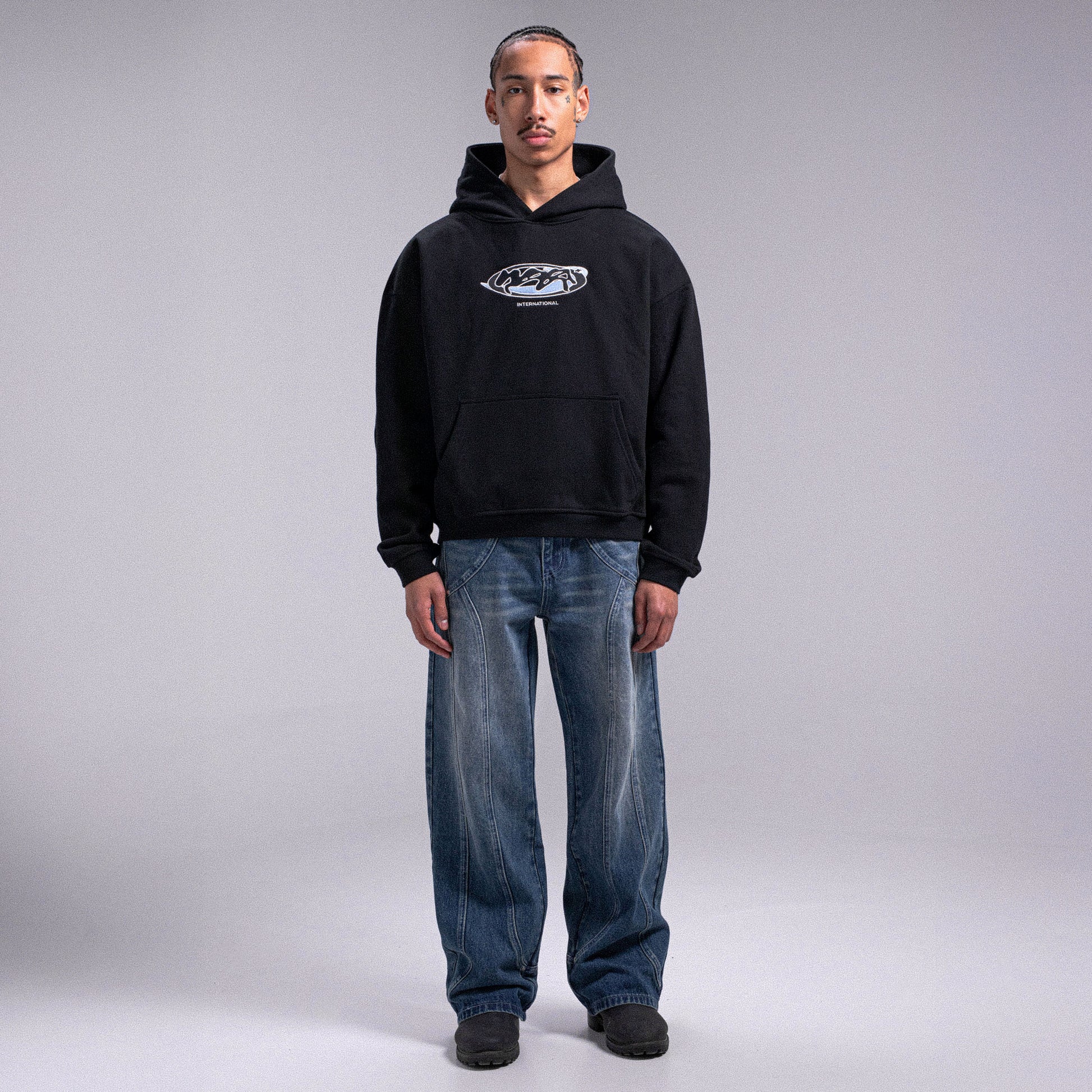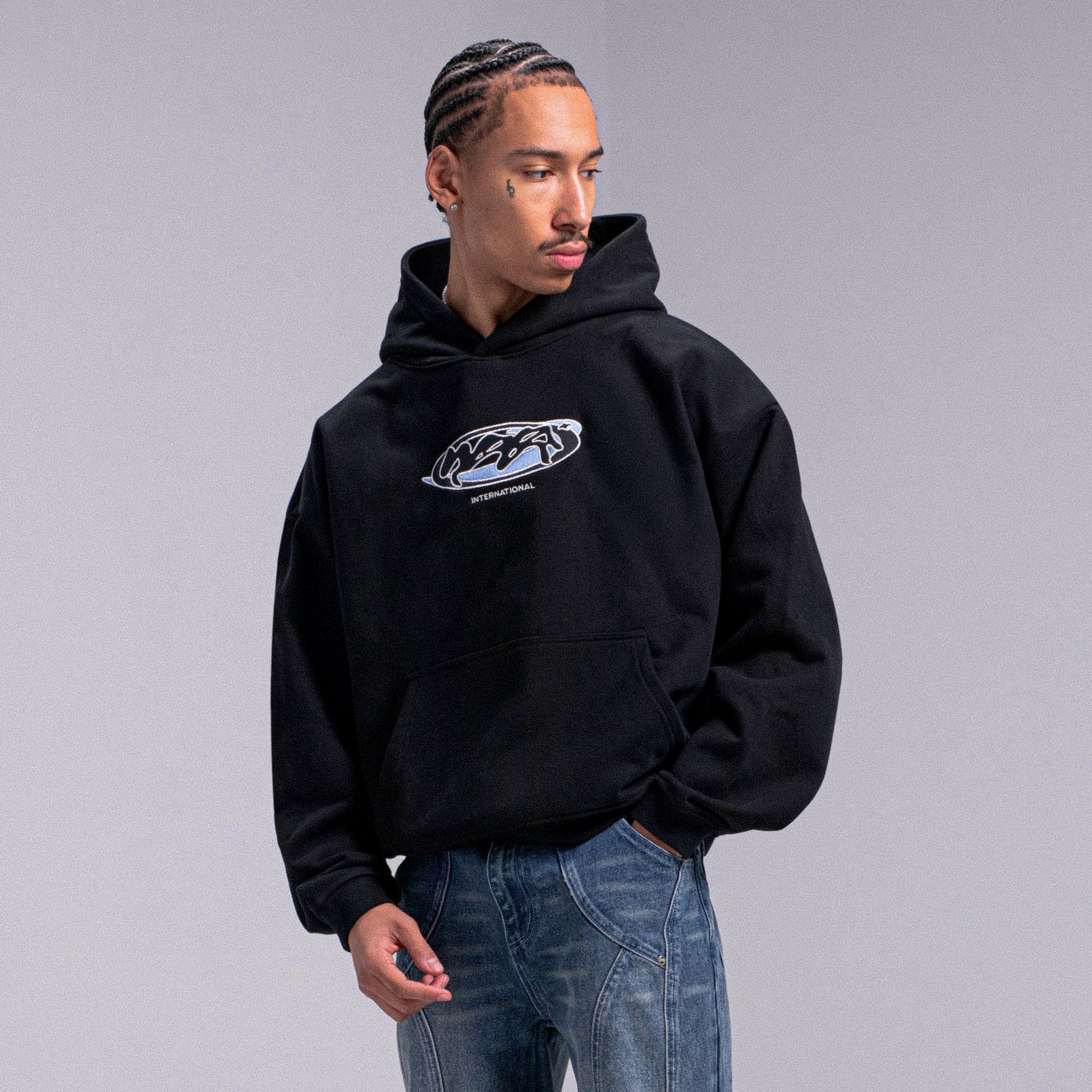 The "INTERNATIONAL" Hoodie is made out of 85% cotton and 15% polyester.
