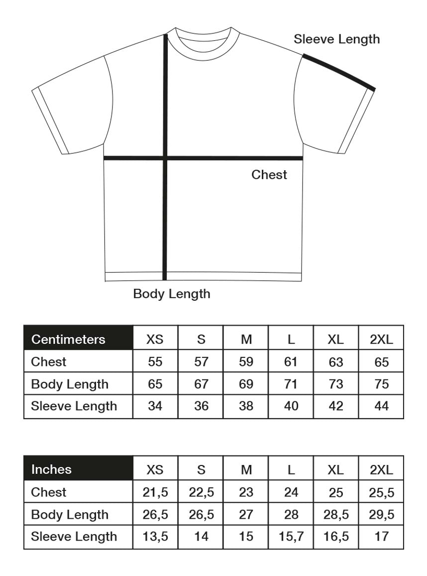 The model is 1m80 (5'9"), 65kg (143lbs) and wears a t-shirt size L for an oversize effect.
