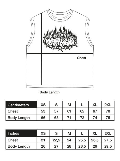 The "HELLFIRE" tanktop is made out of 100% cotton. With a screen printed visual on the front.