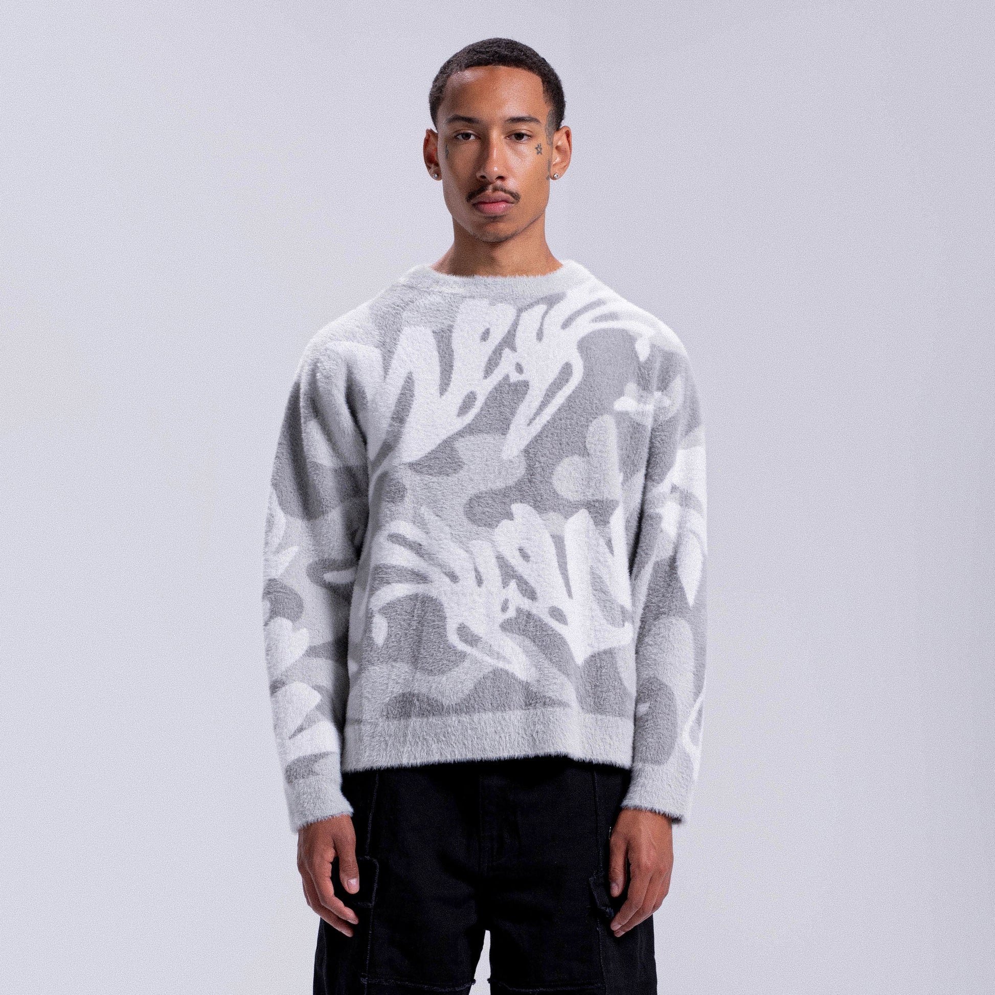 The fluffy knitwear is made of a very soft nylon material with a furry look and the pattern is a blend of different shades of light grey colors mixed with Weyz logos. The cut of the Fluffy Knitwear is classic.