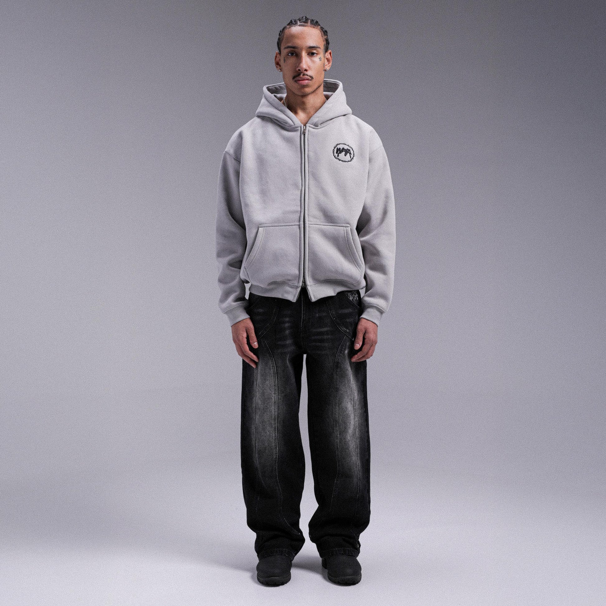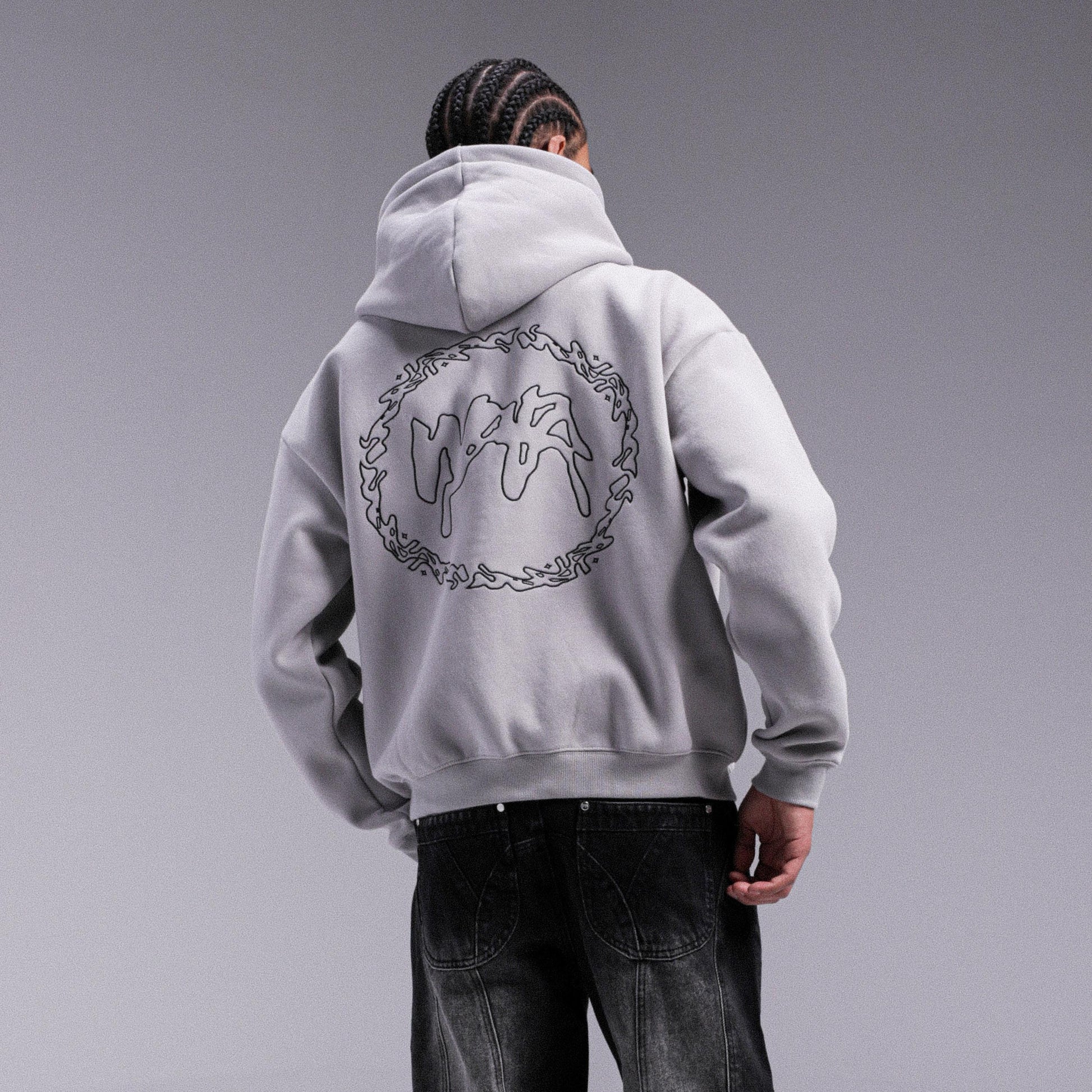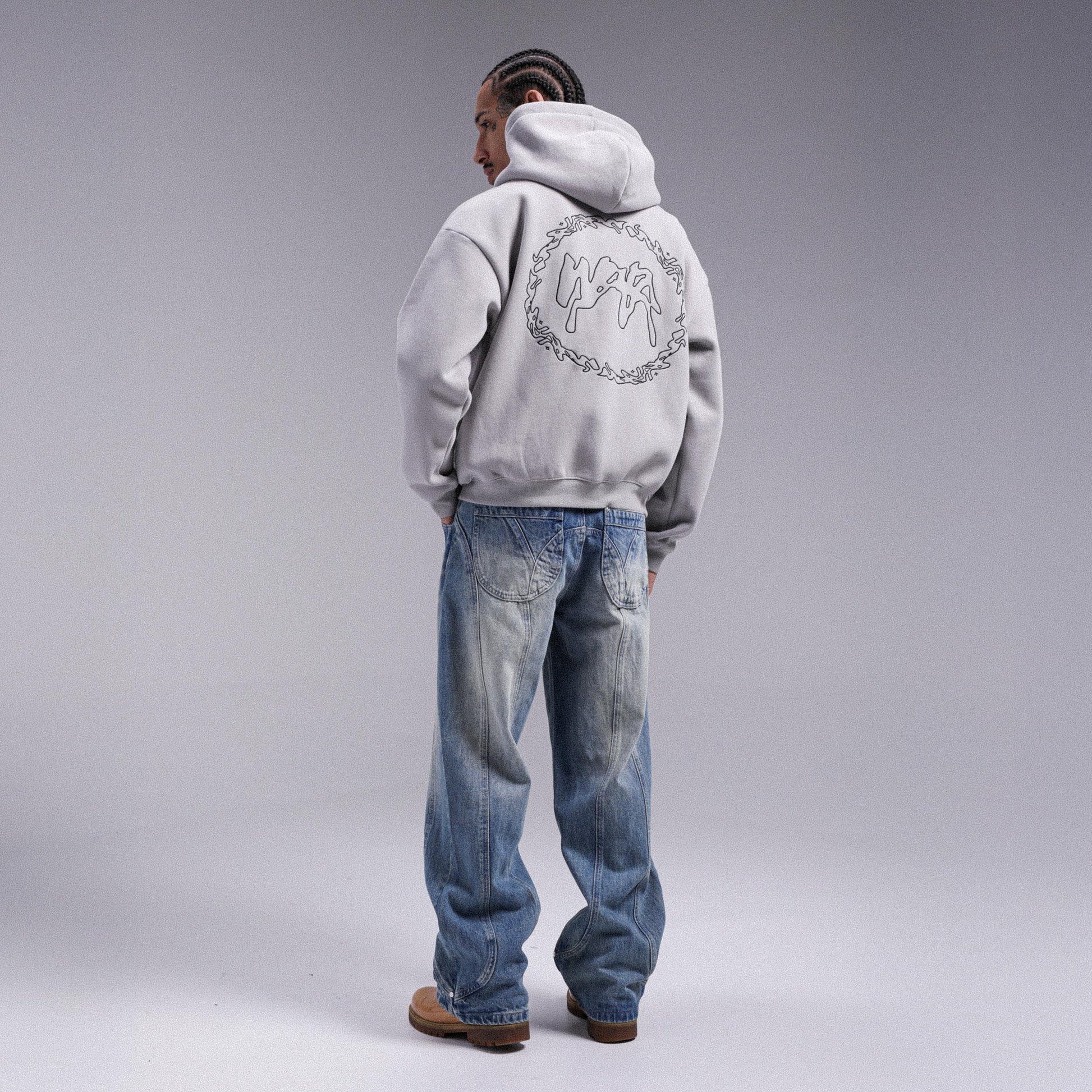 The "CROWN" Double Zip Hoodie is made out of 50% polyester and 50% cotton.