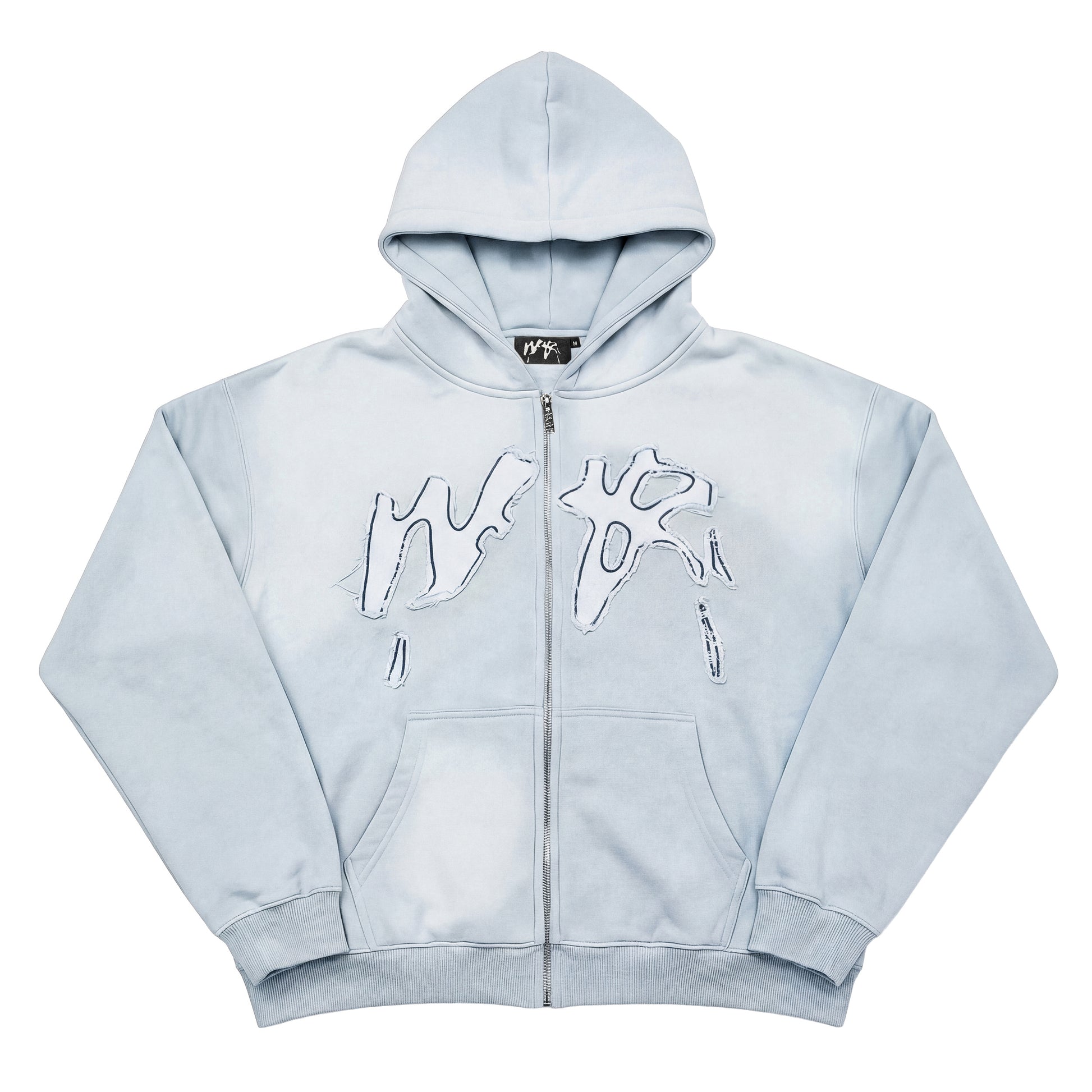 Le devant est orné d'un patch déstructuré, subtilement souligné pour ajouter de la profondeur et de la texture. Une fermeture éclair sur toute la longueur, des poignets et un ourlet côtelés, et une poche kangourou classique.