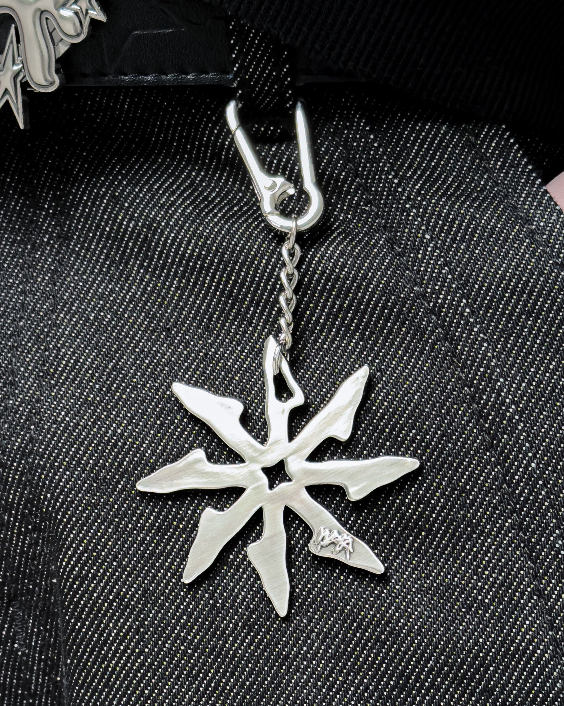 Porte-clés en métal au design sculptural inspiré du shuriken, avec une finition argentée polie.