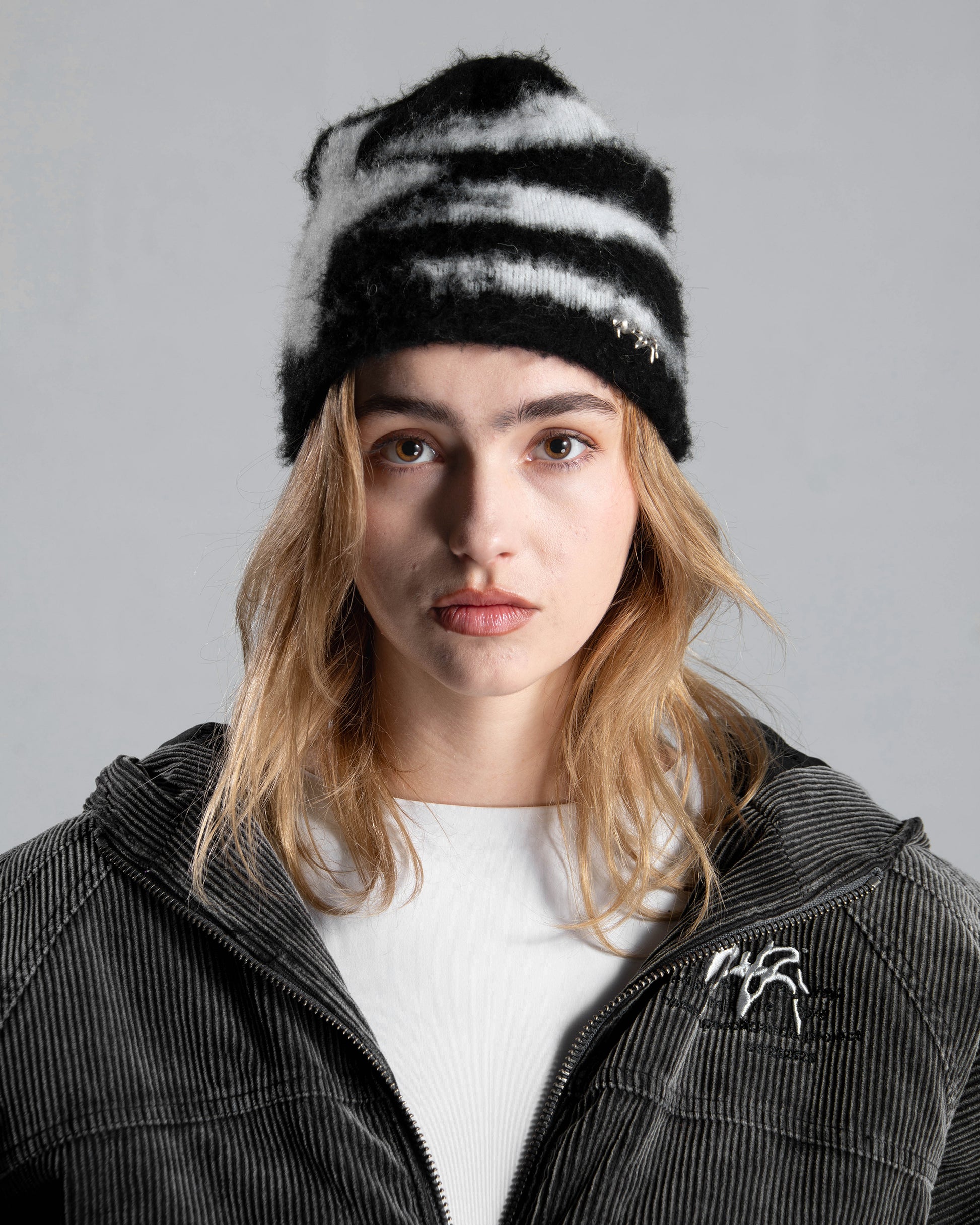 Le bonnet présente un motif tissé flou dans des tons contrastés, créant un effet de diffusion inspiré du mohair, caractéristique de l'identité textile de WEYZ. Un petit emblème métallique WEYZ est placé sur le devant, ajoutant une touche finale subtile.
